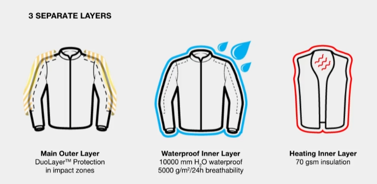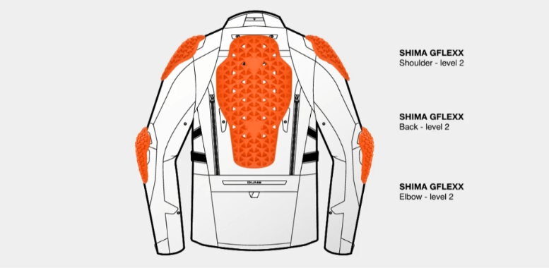 Geaca SHIMA DUNE oferă protecție ridicată datorită DuoLayer Protection™ în zonele predispuse la impact. Construcția, constând într-o armătură textilă durabilă sub protectori, crește semnificativ rezistența la rupturi și abraziuni. Jacheta este echipată cu noile protecții GFLEXX de nivel 2 pentru spate, umeri și coate și are o reglare pe înălțime în 3 poziții a protecțiilor pentru coate pentru o potrivire perfectă la orice formă a corpului. Materialul ripstop întărește și mai mult întreaga structură, asigurând o durabilitate mai mare împotriva deteriorărilor mecanice. Sistemul Night Vision™ - o tehnologie reflectorizantă avansată - crește vizibilitatea după lăsarea întunericului, ceea ce se traduce în siguranță pasivă în timpul călătoriei. Jacheta SHIMA DUNE îndeplinește nivelul european AA de certificare a siguranței.
